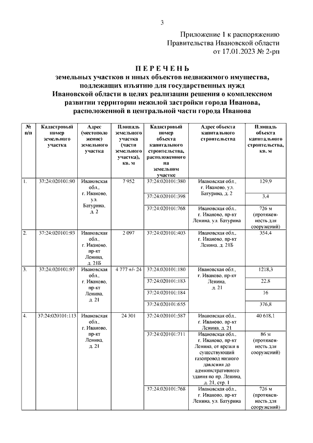 Распоряжение Правительства Ивановской области от 17.01.2023 N 2-рп "Об изъятии земельных участков и расположенных на них объектов недвижимого имущества для государственных нужд Ивановской области в целях реализации решения о комплексном развитии территории нежилой застройки города Иванова, расположенной в центральной части города Иванова"