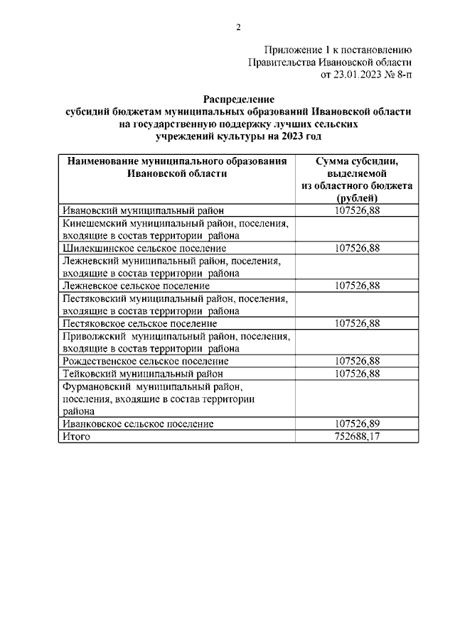 Постановление Правительства Ивановской области от 23.01.2023 N 8-п "О распределении субсидий бюджетам муниципальных образований Ивановской области на государственную поддержку лучших сельских учреждений культуры и государственную поддержку лучших работников сельских учреждений культуры на 2023 год"