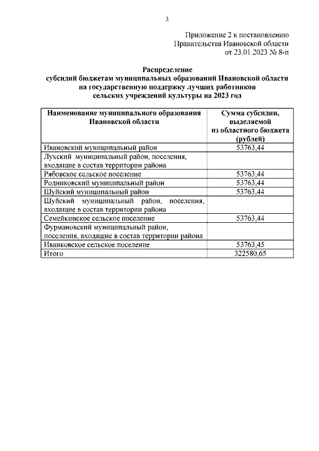 Постановление Правительства Ивановской области от 23.01.2023 N 8-п "О распределении субсидий бюджетам муниципальных образований Ивановской области на государственную поддержку лучших сельских учреждений культуры и государственную поддержку лучших работников сельских учреждений культуры на 2023 год"