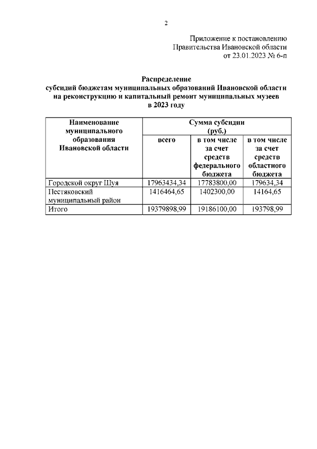 Постановление Правительства Ивановской области от 23.01.2023 N 6-п "О распределении субсидий бюджетам муниципальных образований Ивановской области на реконструкцию и капитальный ремонт муниципальных музеев в 2023 году"
