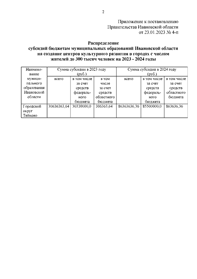 Постановление Правительства Ивановской области от 23.01.2023 N 4-п "О распределении субсидий бюджетам муниципальных образований Ивановской области на создание центров культурного развития в городах с числом жителей до 300 тысяч человек на 2023 - 2024 годы"