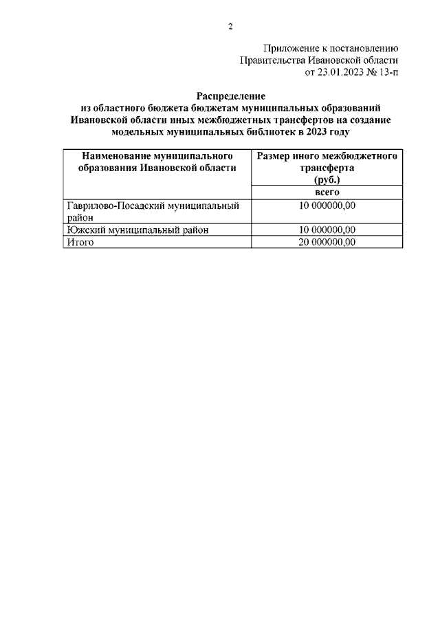 Постановление Правительства Ивановской области от 23.01.2023 N 13-п "О распределении из областного бюджета бюджетам муниципальных образований Ивановской области иных межбюджетных трансфертов на создание модельных муниципальных библиотек в 2023 году"