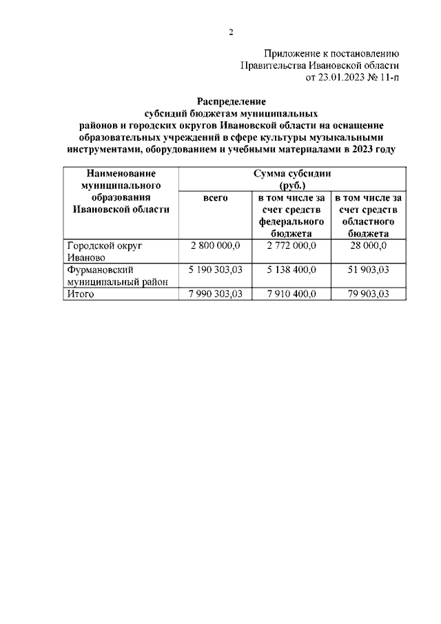 Постановление Правительства Ивановской области от 23.01.2023 N 11-п "О распределении субсидий бюджетам муниципальных районов и городских округов Ивановской области на оснащение образовательных учреждений в сфере культуры музыкальными инструментами, оборудованием и учебными материалами в 2023 году"