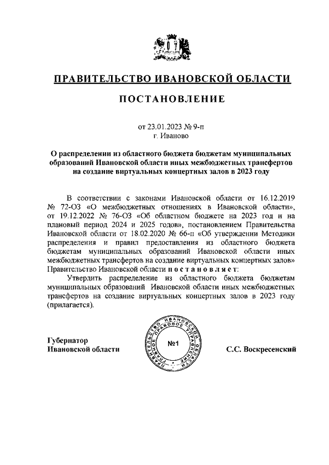 Постановление Правительства Ивановской области от 23.01.2023 N 9-п "О распределении из областного бюджета бюджетам муниципальных образований Ивановской области иных межбюджетных трансфертов на создание виртуальных концертных залов в 2023 году"