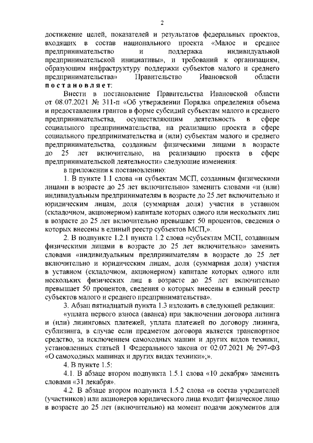 Постановление Правительства Ивановской области от 25.01.2023 N 19-п "О внесении изменений в постановление Правительства Ивановской области от 08.07.2021 N 311-п "Об утверждении Порядка определения объема и предоставления грантов в форме субсидий субъектам малого и среднего предпринимательства, осуществляющим деятельность в сфере социального предпринимательства, на реализацию проекта в сфере социального предпринимательства и (или) субъектам малого и среднего предпринимательства, созданным физическими лицами в возрасте до 25 лет включительно, на реализацию проекта в сфере предпринимательской деятельности"