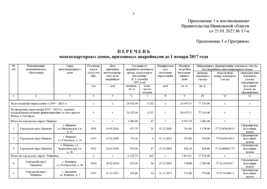 Постановление Правительства Ивановской области от 25.01.2023 N 17-п "О внесении изменений в постановление Правительства Ивановской области от 09.04.2019 N 131-п "Об утверждении региональной адресной программы "Переселение граждан из аварийного жилищного фонда на территории Ивановской области на 2019 - 2023 годы" (вместе с "Перечнем многоквартирных домов, признанных аварийными до 1 января 2017 года", "Планом реализации мероприятий по переселению граждан из аварийного жилищного фонда, признанного таковым до 1 января 2017 года, по способам переселения", "Планом мероприятий по переселению граждан из аварийного жилищного фонда, признанного таковым до 1 января 2017 года")