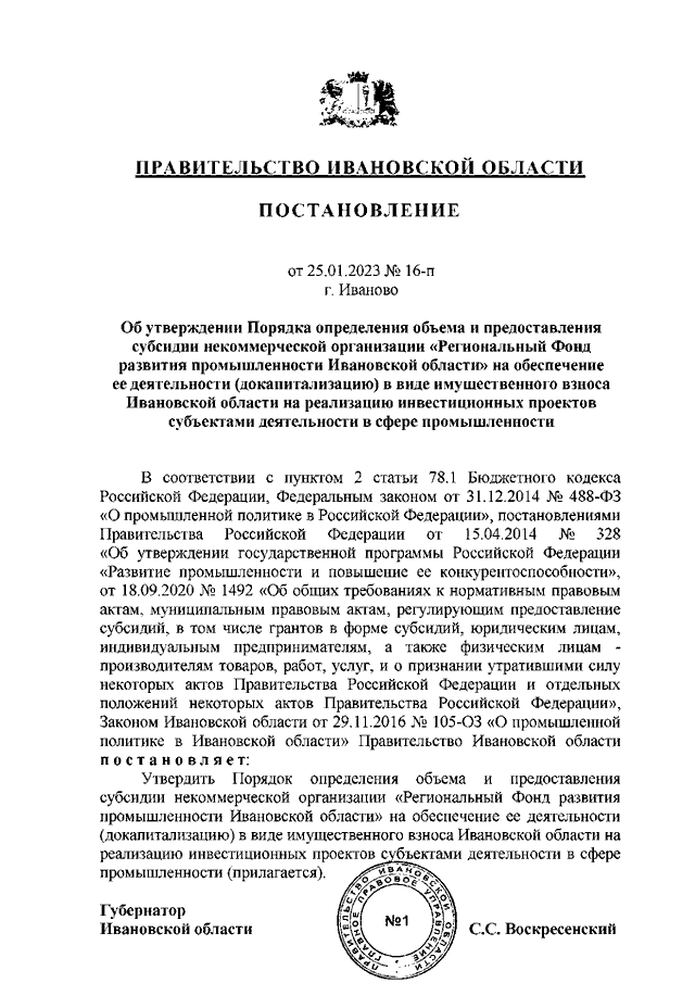 Постановление Правительства Ивановской области от 25.01.2023 N 16-п "Об утверждении Порядка определения объема и предоставления субсидии некоммерческой организации "Региональный Фонд развития промышленности Ивановской области" на обеспечение ее деятельности (докапитализацию) в виде имущественного взноса Ивановской области на реализацию инвестиционных проектов субъектами деятельности в сфере промышленности"