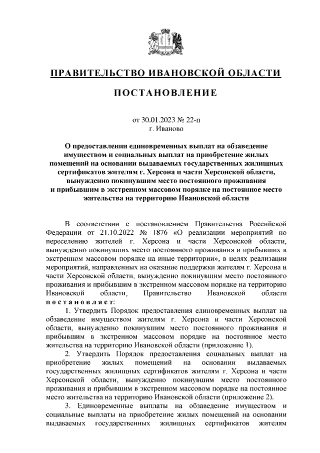Постановление Правительства Ивановской области от 30.01.2023 N 22-п "О предоставлении единовременных выплат на обзаведение имуществом и социальных выплат на приобретение жилых помещений на основании выдаваемых государственных жилищных сертификатов жителям г. Херсона и части Херсонской области, вынужденно покинувшим место постоянного проживания и прибывшим в экстренном массовом порядке на постоянное место жительства на территорию Ивановской области"