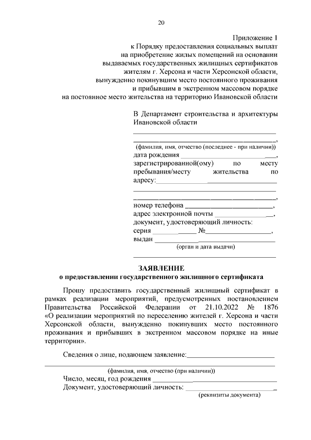 Постановление Правительства Ивановской области от 30.01.2023 N 22-п "О предоставлении единовременных выплат на обзаведение имуществом и социальных выплат на приобретение жилых помещений на основании выдаваемых государственных жилищных сертификатов жителям г. Херсона и части Херсонской области, вынужденно покинувшим место постоянного проживания и прибывшим в экстренном массовом порядке на постоянное место жительства на территорию Ивановской области"