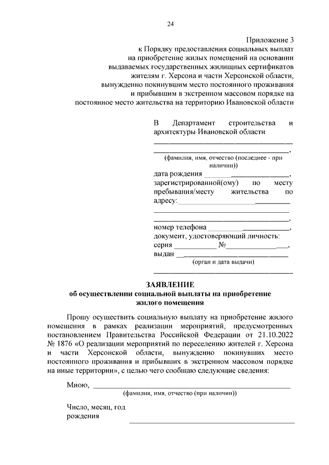 Постановление Правительства Ивановской области от 30.01.2023 N 22-п "О предоставлении единовременных выплат на обзаведение имуществом и социальных выплат на приобретение жилых помещений на основании выдаваемых государственных жилищных сертификатов жителям г. Херсона и части Херсонской области, вынужденно покинувшим место постоянного проживания и прибывшим в экстренном массовом порядке на постоянное место жительства на территорию Ивановской области"