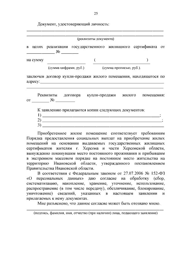 Постановление Правительства Ивановской области от 30.01.2023 N 22-п "О предоставлении единовременных выплат на обзаведение имуществом и социальных выплат на приобретение жилых помещений на основании выдаваемых государственных жилищных сертификатов жителям г. Херсона и части Херсонской области, вынужденно покинувшим место постоянного проживания и прибывшим в экстренном массовом порядке на постоянное место жительства на территорию Ивановской области"