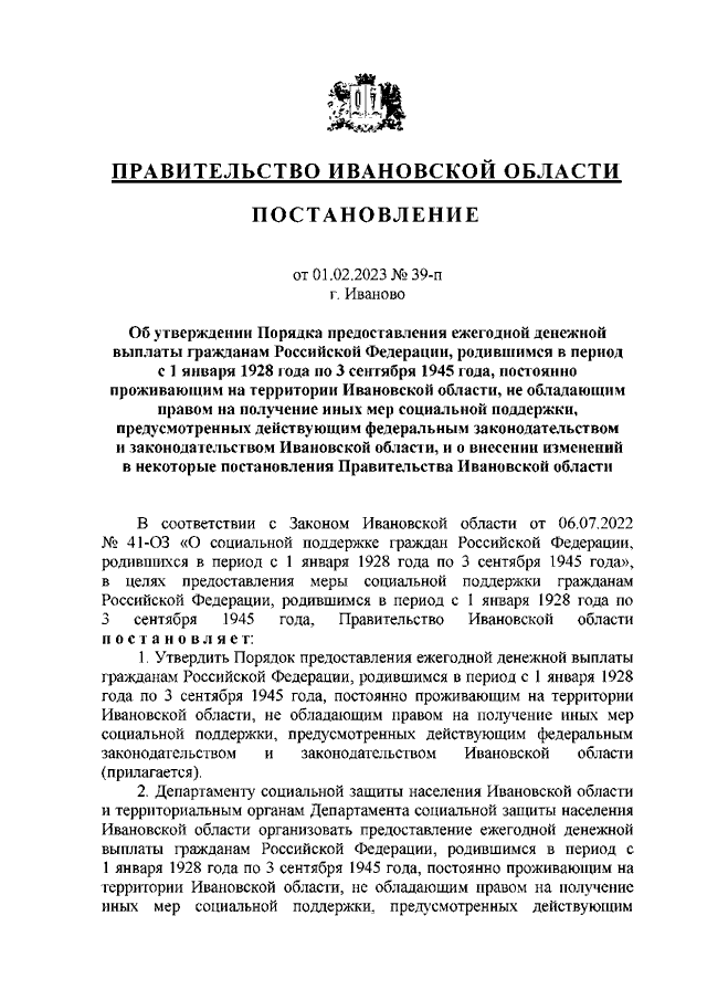 Постановление Правительства Ивановской области от 01.02.2023 N 39-п "Об утверждении Порядка предоставления ежегодной денежной выплаты гражданам Российской Федерации, родившимся в период с 1 января 1928 года по 3 сентября 1945 года, постоянно проживающим на территории Ивановской области, не обладающим правом на получение иных мер социальной поддержки, предусмотренных действующим федеральным законодательством и законодательством Ивановской области, и о внесении изменений в некоторые постановления Правительства Ивановской области"