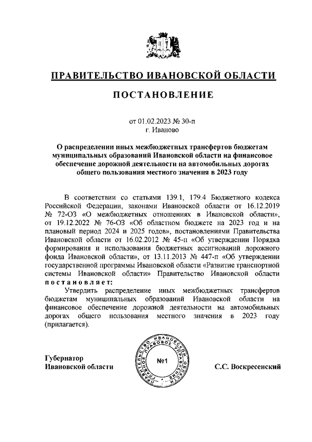 Постановление Правительства Ивановской области от 01.02.2023 N 30-п "О распределении иных межбюджетных трансфертов бюджетам муниципальных образований Ивановской области на финансовое обеспечение дорожной деятельности на автомобильных дорогах общего пользования местного значения в 2023 году"