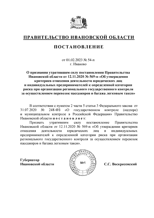 Постановление Правительства Ивановской области от 01.02.2023 N 54-п "О признании утратившим силу постановления Правительства Ивановской области от 12.11.2020 N 569-п "Об утверждении критериев отнесения деятельности юридических лиц и индивидуальных предпринимателей к определенной категории риска при организации регионального государственного контроля за осуществлением перевозок пассажиров и багажа легковым такси"