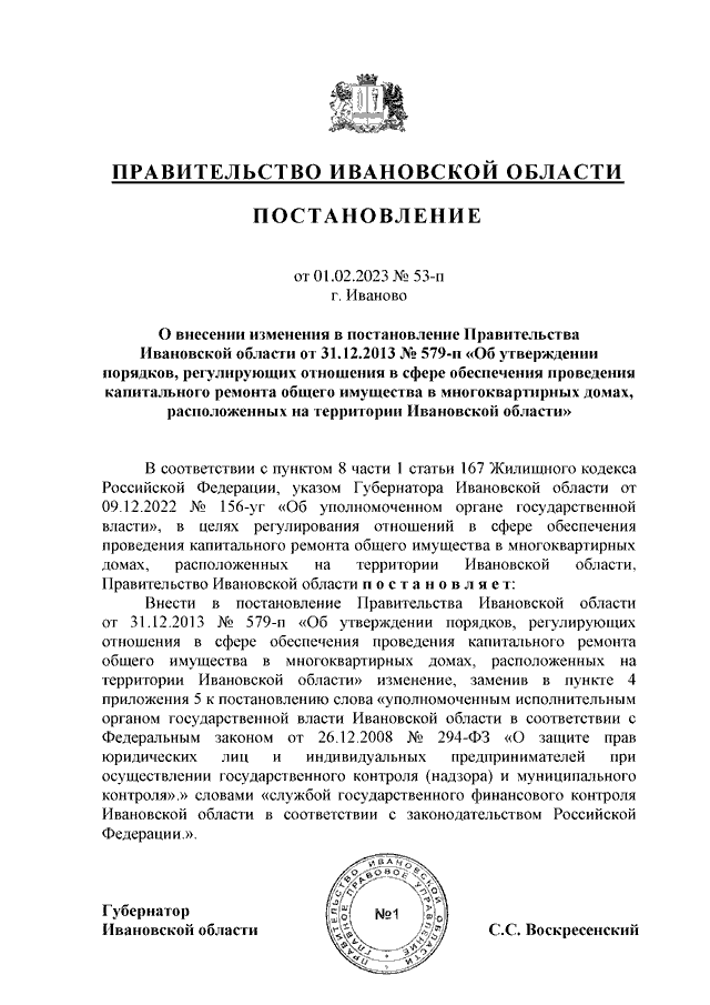 Постановление Правительства Ивановской области от 01.02.2023 N 53-п "О внесении изменения в постановление Правительства Ивановской области от 31.12.2013 N 579-п "Об утверждении порядков, регулирующих отношения в сфере обеспечения проведения капитального ремонта общего имущества в многоквартирных домах, расположенных на территории Ивановской области"