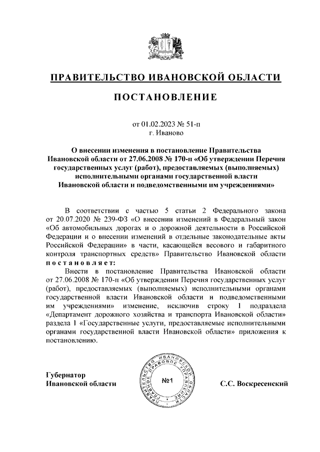 Постановление Правительства Ивановской области от 01.02.2023 N 51-п "О внесении изменения в постановление Правительства Ивановской области от 27.06.2008 N 170-п "Об утверждении Перечня государственных услуг (работ), предоставляемых (выполняемых) исполнительными органами государственной власти Ивановской области и подведомственными им учреждениями"