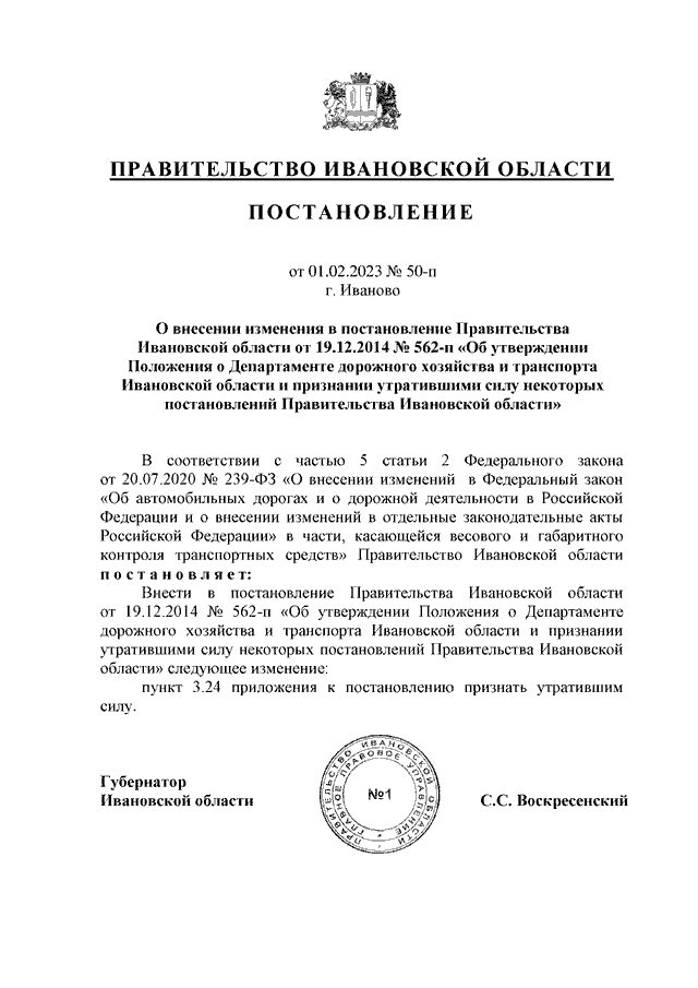 Постановление Правительства Ивановской области от 01.02.2023 N 50-п "О внесении изменения в постановление Правительства Ивановской области от 19.12.2014 N 562-п "Об утверждении Положения о Департаменте дорожного хозяйства и транспорта Ивановской области и признании утратившими силу некоторых постановлений Правительства Ивановской области"
