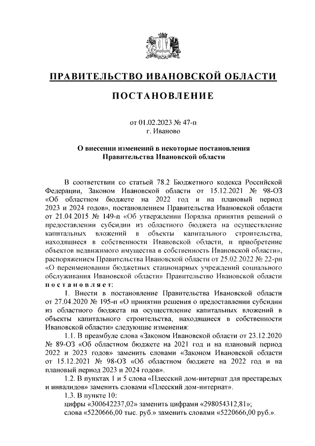 Постановление Правительства Ивановской области от 01.02.2023 N 47-п "О внесении изменений в некоторые постановления Правительства Ивановской области"
