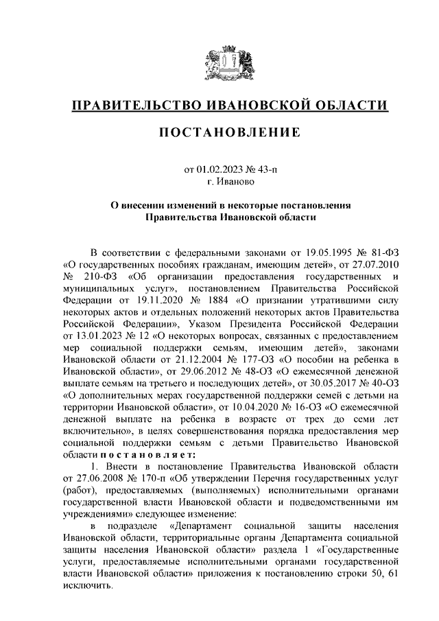 Постановление Правительства Ивановской области от 01.02.2023 N 43-п "О внесении изменений в некоторые постановления Правительства Ивановской области"