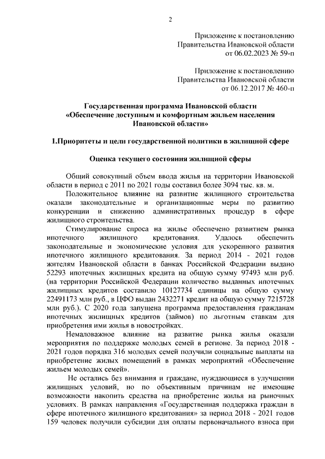 Постановление Правительства Ивановской области от 06.02.2023 N 59-п "О внесении изменений в постановление Правительства Ивановской области от 06.12.2017 N 460-п "Об утверждении государственной программы Ивановской области "Обеспечение доступным и комфортным жильем населения Ивановской области"