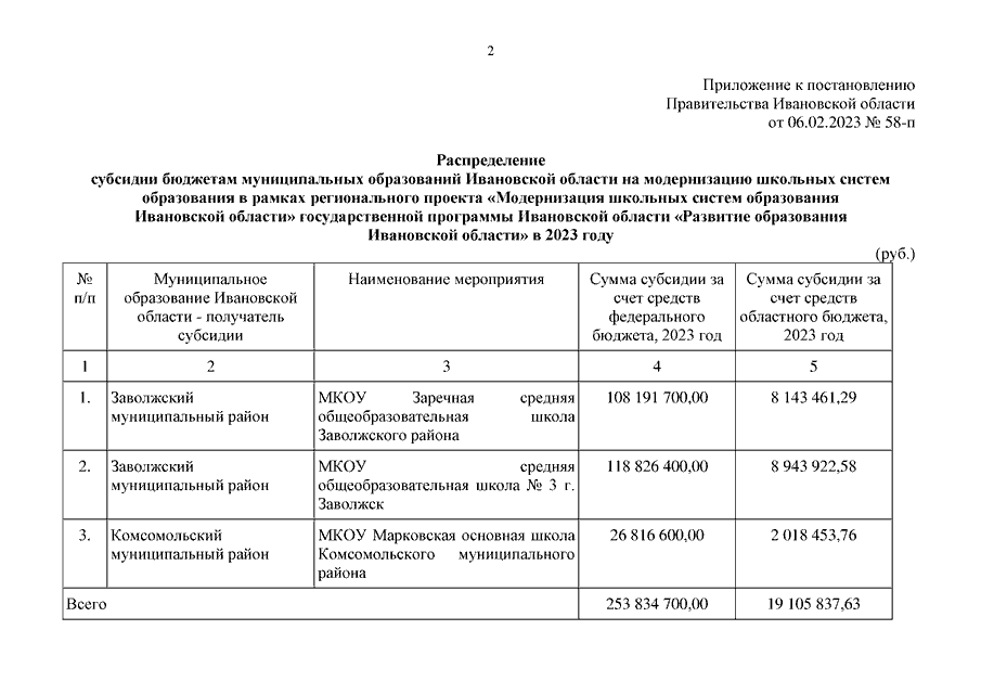 Постановление Правительства Ивановской области от 06.02.2023 N 58-п "О распределении субсидии бюджетам муниципальных образований Ивановской области на модернизацию школьных систем образования в рамках регионального проекта "Модернизация школьных систем образования Ивановской области" государственной программы Ивановской области "Развитие образования Ивановской области" в 2023 году"