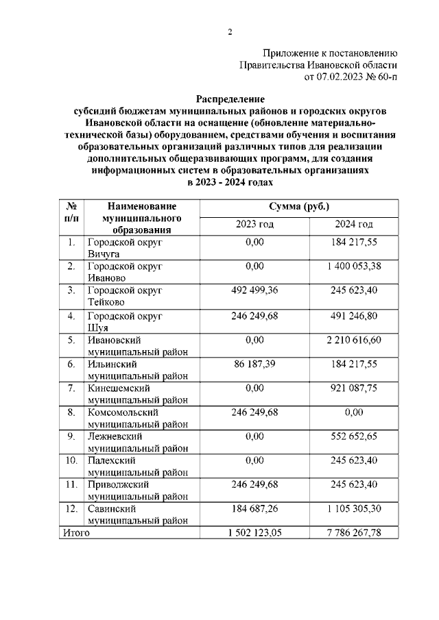 Постановление Правительства Ивановской области от 07.02.2023 N 60-п "Об утверждении распределения субсидий бюджетам муниципальных районов и городских округов Ивановской области на оснащение (обновление материально-технической базы) оборудованием, средствами обучения и воспитания образовательных организаций различных типов для реализации дополнительных общеразвивающих программ, для создания информационных систем в образовательных организациях в 2023 - 2024 годах"