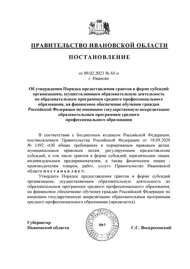Постановление Правительства Ивановской области от 09.02.2023 N 65-п "Об утверждении Порядка предоставления грантов в форме субсидий организациям, осуществляющим образовательную деятельность по образовательным программам среднего профессионального образования, на финансовое обеспечение обучения граждан Российской Федерации по имеющим государственную аккредитацию образовательным программам среднего профессионального образования"