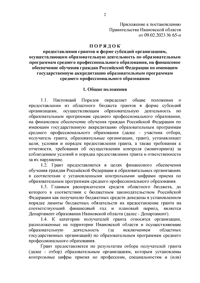 Постановление Правительства Ивановской области от 09.02.2023 N 65-п "Об утверждении Порядка предоставления грантов в форме субсидий организациям, осуществляющим образовательную деятельность по образовательным программам среднего профессионального образования, на финансовое обеспечение обучения граждан Российской Федерации по имеющим государственную аккредитацию образовательным программам среднего профессионального образования"