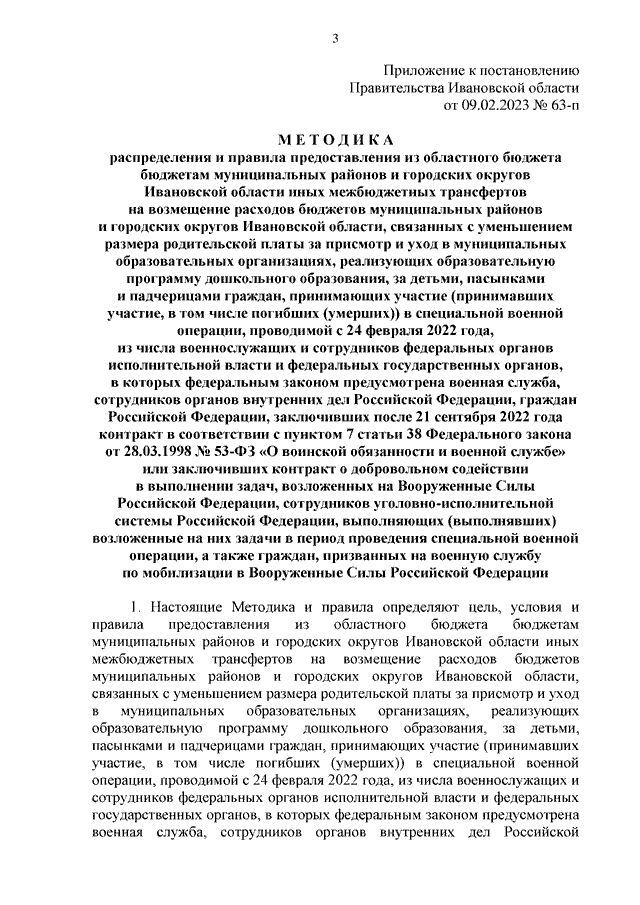 Постановление Правительства Ивановской области от 09.02.2023 N 63-п "О возмещении расходов бюджетов муниципальных районов и городских округов Ивановской области, связанных с уменьшением размера родительской платы за присмотр и уход в муниципальных образовательных организациях, реализующих образовательную программу дошкольного образования, за детьми, пасынками и падчерицами граждан, принимающих участие (принимавших участие, в том числе погибших (умерших)) в специальной военной операции, проводимой с 24 февраля 2022 года, из числа военнослужащих и сотрудников федеральных органов исполнительной власти и федеральных государственных органов, в которых федеральным законом предусмотрена военная служба, сотрудников органов внутренних дел Российской Федерации, граждан Российской Федерации, заключивших после 21 сентября 2022 года контракт в соответствии с пунктом 7 статьи 38 Федерального закона от 28.03.1998 N 53-ФЗ "О воинской обязанности и военной службе" или заключивших контракт о добровольном содействии в выполнении задач, возложенных на Вооруженные Силы Российской Федерации, сотрудников уголовно-исполнительной системы Российской Федерации, выполняющих (выполнявших) возложенные на них задачи в период проведения специальной военной операции, а также граждан, призванных на военную службу по мобилизации в Вооруженные Силы Российской Федерации" (вместе с "Методикой распределения и правилами предоставления из областного бюджета бюджетам муниципальных районов и городских округов Ивановской области иных межбюджетных трансфертов на возмещение расходов бюджетов муниципальных районов и городских округов Ивановской области, связанных с уменьшением размера родительской платы за присмотр и уход в муниципальных образовательных организациях, реализующих образовательную программу дошкольного образования, за детьми, пасынками и падчерицами граждан, принимающих участие (принимавших участие, в том числе погибших (умерших)) в специальной военной операции, проводимой с 24 февраля 2022 года, из числа военнослужащих и сотрудников федеральных органов исполнительной власти и федеральных государственных органов, в которых федеральным законом предусмотрена военная служба, сотрудников органов внутренних дел Российской Федерации, граждан Российской Федерации, заключивших после 21 сентября 2022 года контракт в соответствии с пунктом 7 статьи 38 Федерального закона от 28.03.1998 N 53-ФЗ "О воинской обязанности и военной службе" или заключивших контракт о добровольном содействии в выполнении задач, возложенных на Вооруженные Силы Российской Федерации, сотрудников уголовно-исполнительной системы Российской Федерации, выполняющих (выполнявших) возложенные на них задачи в период проведения специальной военной операции, а также граждан, призванных на военную службу по мобилизации в Вооруженные Силы Российской Федерации")