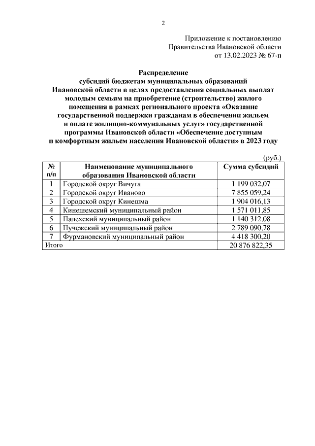 Постановление Правительства Ивановской области от 13.02.2023 N 67-п "О распределении субсидий бюджетам муниципальных образований Ивановской области в целях предоставления социальных выплат молодым семьям на приобретение (строительство) жилого помещения в рамках регионального проекта "Оказание государственной поддержки гражданам в обеспечении жильем и оплате жилищно-коммунальных услуг" государственной программы Ивановской области "Обеспечение доступным и комфортным жильем населения Ивановской области" в 2023 году"