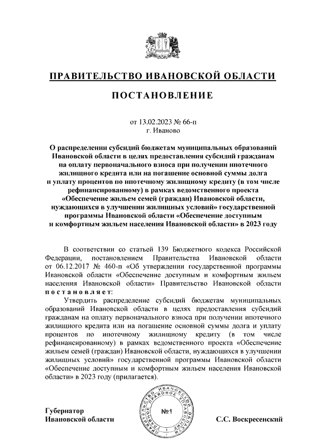 Постановление Правительства Ивановской области от 13.02.2023 N 66-п "О распределении субсидий бюджетам муниципальных образований Ивановской области в целях предоставления субсидий гражданам на оплату первоначального взноса при получении ипотечного жилищного кредита или на погашение основной суммы долга и уплату процентов по ипотечному жилищному кредиту (в том числе рефинансированному) в рамках ведомственного проекта "Обеспечение жильем семей (граждан) Ивановской области, нуждающихся в улучшении жилищных условий" государственной программы Ивановской области "Обеспечение доступным и комфортным жильем населения Ивановской области" в 2023 году"