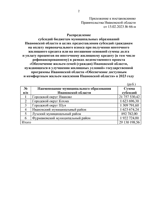 Постановление Правительства Ивановской области от 13.02.2023 N 66-п "О распределении субсидий бюджетам муниципальных образований Ивановской области в целях предоставления субсидий гражданам на оплату первоначального взноса при получении ипотечного жилищного кредита или на погашение основной суммы долга и уплату процентов по ипотечному жилищному кредиту (в том числе рефинансированному) в рамках ведомственного проекта "Обеспечение жильем семей (граждан) Ивановской области, нуждающихся в улучшении жилищных условий" государственной программы Ивановской области "Обеспечение доступным и комфортным жильем населения Ивановской области" в 2023 году"