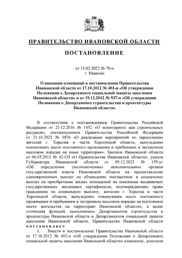 Постановление Правительства Ивановской области от 15.02.2023 N 70-п "О внесении изменений в постановления Правительства Ивановской области от 17.10.2012 N 403-п "Об утверждении Положения о Департаменте социальной защиты населения Ивановской области" и от 19.12.2012 N 537-п "Об утверждении Положения о Департаменте строительства и архитектуры Ивановской области"