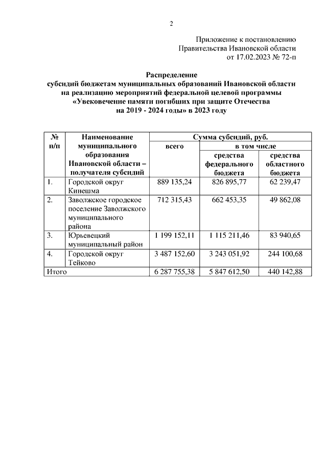 Постановление Правительства Ивановской области от 17.02.2023 N 72-п "О распределении субсидий бюджетам муниципальных образований Ивановской области на реализацию мероприятий федеральной целевой программы "Увековечение памяти погибших при защите Отечества на 2019 - 2024 годы" в 2023 году"