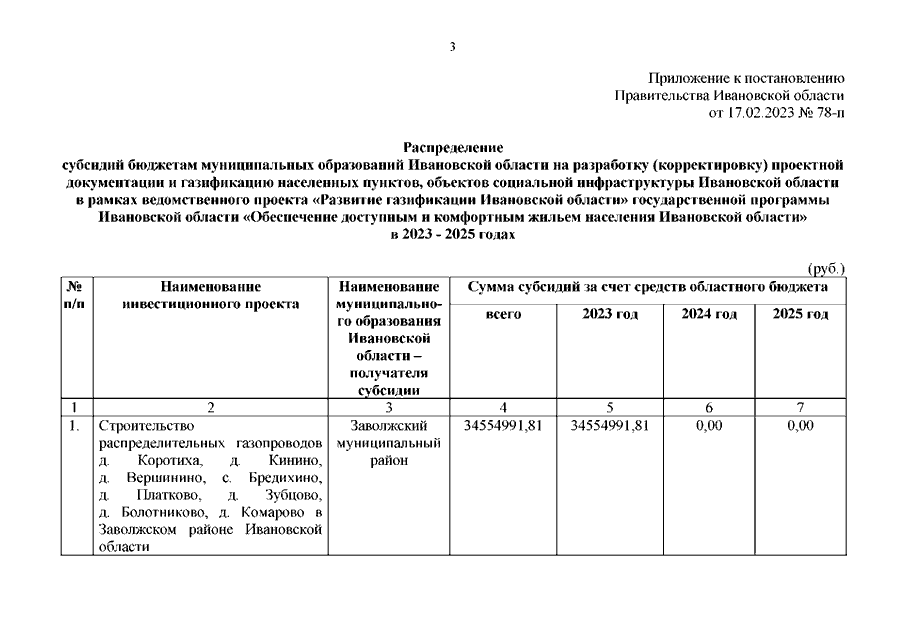 Постановление Правительства Ивановской области от 17.02.2023 N 78-п "О распределении субсидий бюджетам муниципальных образований Ивановской области на разработку (корректировку) проектной документации и газификацию населенных пунктов, объектов социальной инфраструктуры Ивановской области в рамках ведомственного проекта "Развитие газификации Ивановской области" государственной программы Ивановской области "Обеспечение доступным и комфортным жильем населения Ивановской области" в 2023 - 2025 годах"