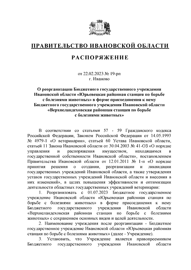 Распоряжение Правительства Ивановской области от 22.02.2023 N 19-рп "О реорганизации Бюджетного государственного учреждения Ивановской области "Юрьевецкая районная станция по борьбе с болезнями животных" в форме присоединения к нему Бюджетного государственного учреждения Ивановской области "Верхнеландеховская районная станция по борьбе с болезнями животных"