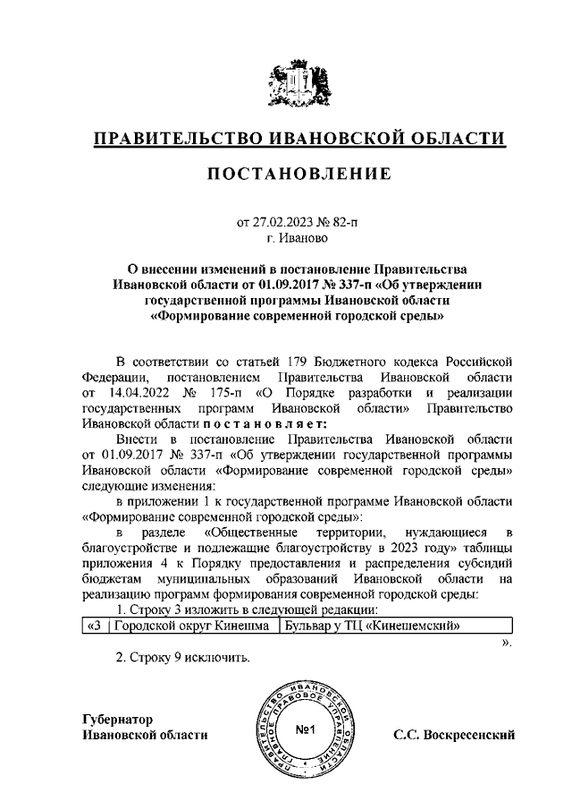 Постановление Правительства Ивановской области от 27.02.2023 N 82-п "О внесении изменений в постановление Правительства Ивановской области от 01.09.2017 N 337-п "Об утверждении государственной программы Ивановской области "Формирование современной городской среды"