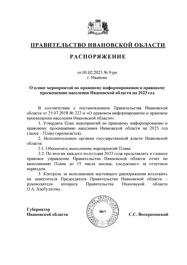 Распоряжение Правительства Ивановской области от 01.02.2023 N 9-рп "О плане мероприятий по правовому информированию и правовому просвещению населения Ивановской области на 2023 год"