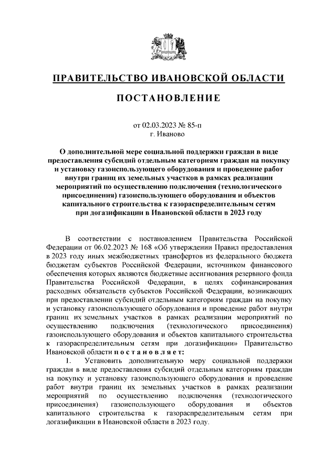 Постановление Правительства Ивановской области от 02.03.2023 N 85-п "О дополнительной мере социальной поддержки граждан в виде предоставления субсидий отдельным категориям граждан на покупку и установку газоиспользующего оборудования и проведение работ внутри границ их земельных участков в рамках реализации мероприятий по осуществлению подключения (технологического присоединения) газоиспользующего оборудования и объектов капитального строительства к газораспределительным сетям при догазификации в Ивановской области в 2023 году" (вместе с "Порядком предоставления субсидий отдельным категориям граждан на покупку и установку газоиспользующего оборудования и проведение работ внутри границ их земельных участков в рамках реализации мероприятий по осуществлению подключения (технологического присоединения) газоиспользующего оборудования и объектов капитального строительства к газораспределительным сетям при догазификации в Ивановской области в 2023 году", "Положением о порядке возврата Ивановской областью в федеральный бюджет денежных средств иного межбюджетного трансферта из федерального бюджета бюджету Ивановской области, источником финансового обеспечения которого являются бюджетные ассигнования резервного фонда Правительства Российской Федерации, в целях софинансирования расходных обязательств Ивановской области, возникающих при предоставлении субсидий отдельным категориям граждан на покупку и установку газоиспользующего оборудования и проведение работ внутри границ их земельных участков в рамках реализации мероприятий по осуществлению подключения (технологического присоединения) газоиспользующего оборудования и объектов капитального строительства к газораспределительным сетям при догазификации в Ивановской области")