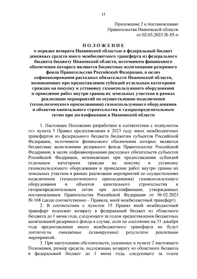 Постановление Правительства Ивановской области от 02.03.2023 N 85-п "О дополнительной мере социальной поддержки граждан в виде предоставления субсидий отдельным категориям граждан на покупку и установку газоиспользующего оборудования и проведение работ внутри границ их земельных участков в рамках реализации мероприятий по осуществлению подключения (технологического присоединения) газоиспользующего оборудования и объектов капитального строительства к газораспределительным сетям при догазификации в Ивановской области в 2023 году" (вместе с "Порядком предоставления субсидий отдельным категориям граждан на покупку и установку газоиспользующего оборудования и проведение работ внутри границ их земельных участков в рамках реализации мероприятий по осуществлению подключения (технологического присоединения) газоиспользующего оборудования и объектов капитального строительства к газораспределительным сетям при догазификации в Ивановской области в 2023 году", "Положением о порядке возврата Ивановской областью в федеральный бюджет денежных средств иного межбюджетного трансферта из федерального бюджета бюджету Ивановской области, источником финансового обеспечения которого являются бюджетные ассигнования резервного фонда Правительства Российской Федерации, в целях софинансирования расходных обязательств Ивановской области, возникающих при предоставлении субсидий отдельным категориям граждан на покупку и установку газоиспользующего оборудования и проведение работ внутри границ их земельных участков в рамках реализации мероприятий по осуществлению подключения (технологического присоединения) газоиспользующего оборудования и объектов капитального строительства к газораспределительным сетям при догазификации в Ивановской области")