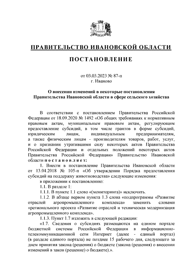Постановление Правительства Ивановской области от 03.03.2023 N 87-п "О внесении изменений в некоторые постановления Правительства Ивановской области в сфере сельского хозяйства" (вместе с "Результатами предоставления субсидии на поддержку животноводства")