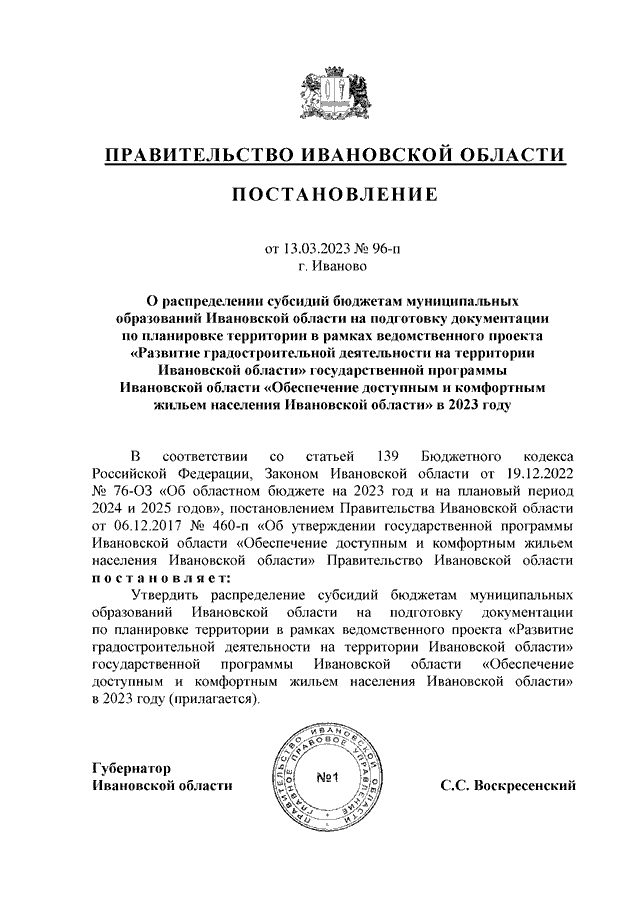 Постановление Правительства Ивановской области от 13.03.2023 N 96-п "О распределении субсидий бюджетам муниципальных образований Ивановской области на подготовку документации по планировке территории в рамках ведомственного проекта "Развитие градостроительной деятельности на территории Ивановской области" государственной программы Ивановской области "Обеспечение доступным и комфортным жильем населения Ивановской области" в 2023 году"
