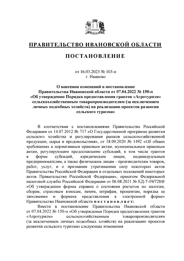 Постановление Правительства Ивановской области от 16.03.2023 N 103-п "О внесении изменений в постановление Правительства Ивановской области от 07.04.2022 N 150-п "Об утверждении Порядка предоставления грантов "Агротуризм" сельскохозяйственным товаропроизводителям (за исключением личных подсобных хозяйств) на реализацию проектов развития сельского туризма"