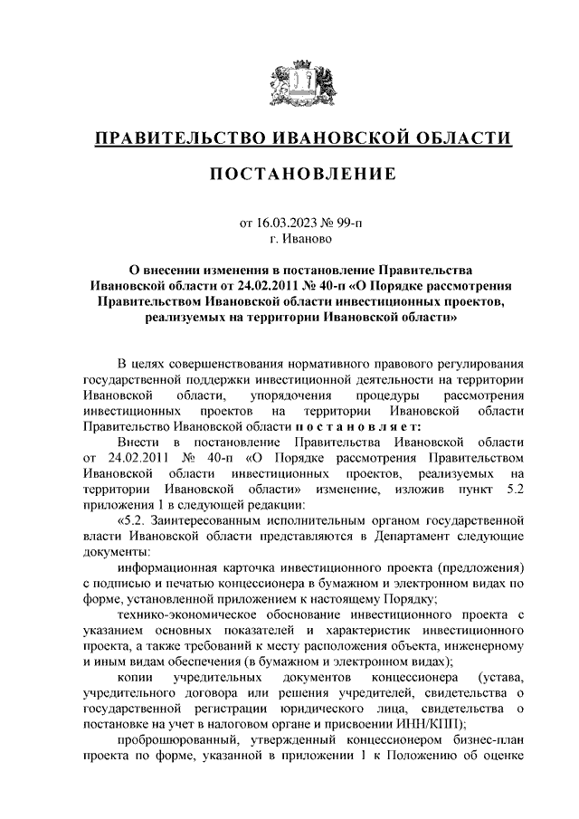 Постановление Правительства Ивановской области от 16.03.2023 N 99-п "О внесении изменения в постановление Правительства Ивановской области от 24.02.2011 N 40-п "О Порядке рассмотрения Правительством Ивановской области инвестиционных проектов, реализуемых на территории Ивановской области"
