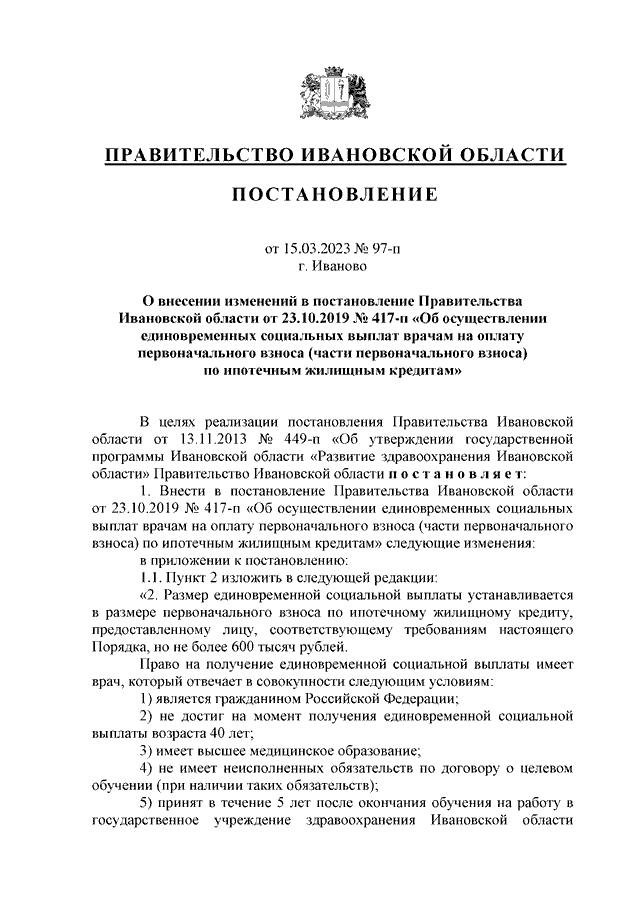 Постановление Правительства Ивановской области от 15.03.2023 N 97-п "О внесении изменений в постановление Правительства Ивановской области от 23.10.2019 N 417-п "Об осуществлении единовременных социальных выплат врачам на оплату первоначального взноса (части первоначального взноса) по ипотечным жилищным кредитам"