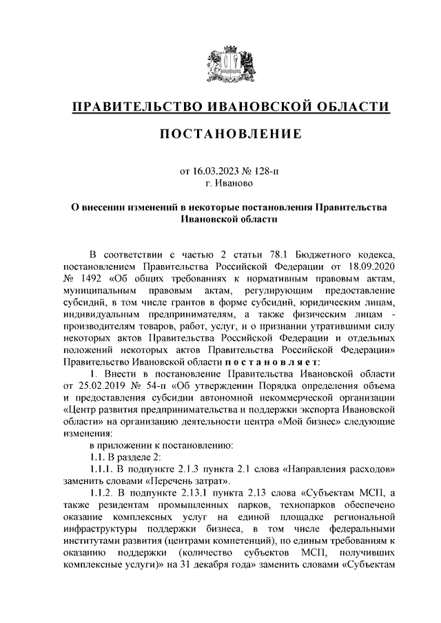 Постановление Правительства Ивановской области от 16.03.2023 N 128-п "О внесении изменений в некоторые постановления Правительства Ивановской области"