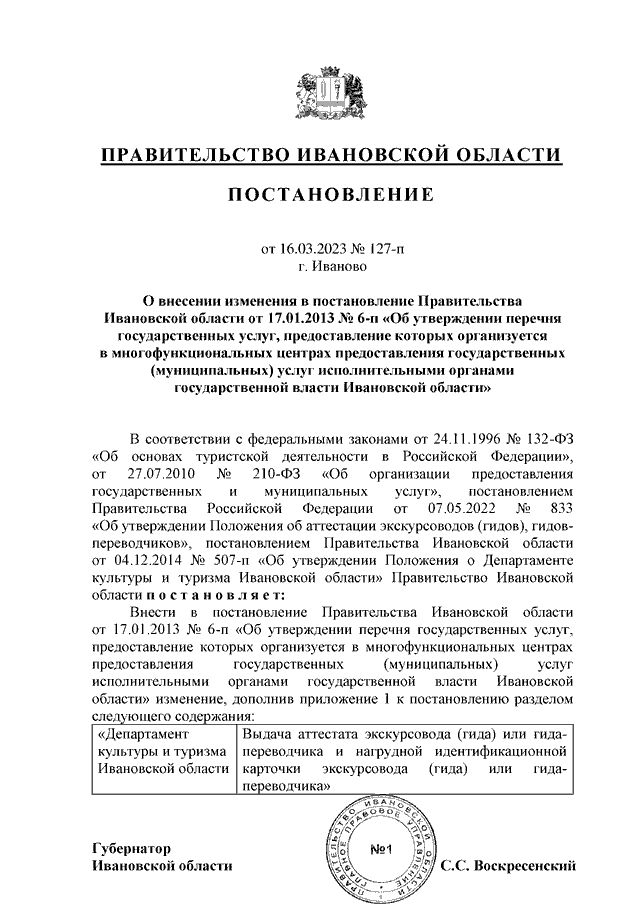 Постановление Правительства Ивановской области от 16.03.2023 N 127-п "О внесении изменения в постановление Правительства Ивановской области от 17.01.2013 N 6-п "Об утверждении перечня государственных услуг, предоставление которых организуется в многофункциональных центрах предоставления государственных (муниципальных) услуг исполнительными органами государственной власти Ивановской области"