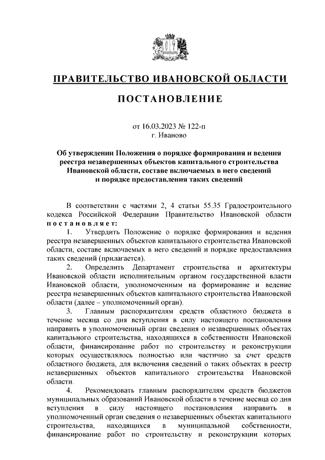 Постановление Правительства Ивановской области от 16.03.2023 N 122-п "Об утверждении Положения о порядке формирования и ведения реестра незавершенных объектов капитального строительства Ивановской области, составе включаемых в него сведений и порядке предоставления таких сведений"