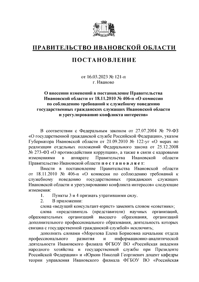 Постановление Правительства Ивановской области от 16.03.2023 N 121-п "О внесении изменений в постановление Правительства Ивановской области от 18.11.2010 N 406-п "О комиссии по соблюдению требований к служебному поведению государственных гражданских служащих Ивановской области и урегулированию конфликта интересов"