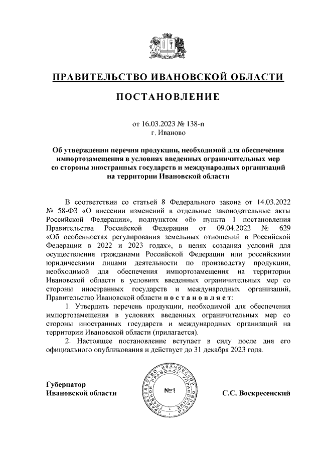Постановление Правительства Ивановской области от 16.03.2023 N 138-п "Об утверждении перечня продукции, необходимой для обеспечения импортозамещения в условиях введенных ограничительных мер со стороны иностранных государств и международных организаций на территории Ивановской области"